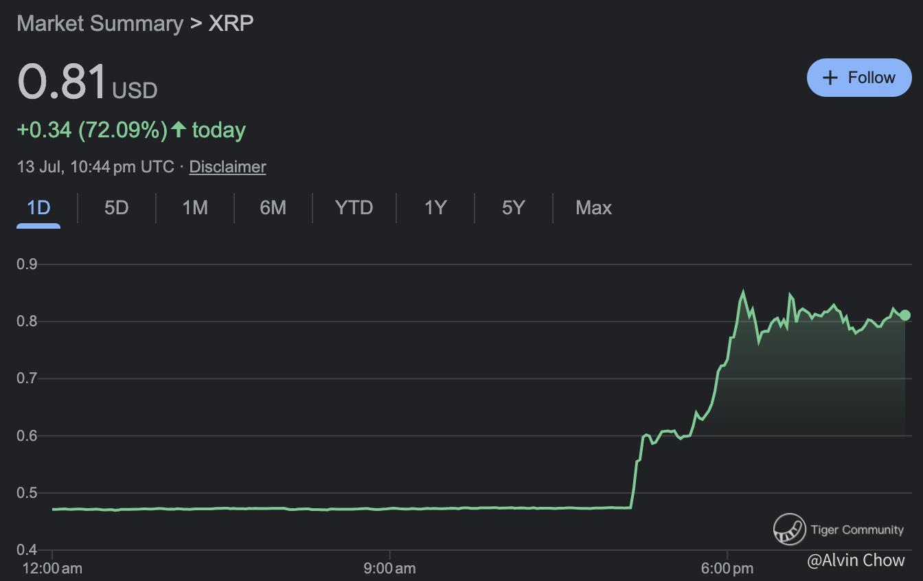 This ruling caused a surge in XRP's value, increasing by 72% in a single day.