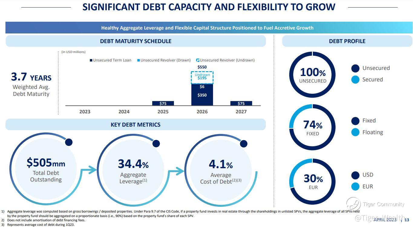 DCREIT’s aggregate leverage is at 34.4%, with average cost of debt at 4.1%. With a global ROFR pipeline from its sponsor, there is still scope for DCREIT togrow.