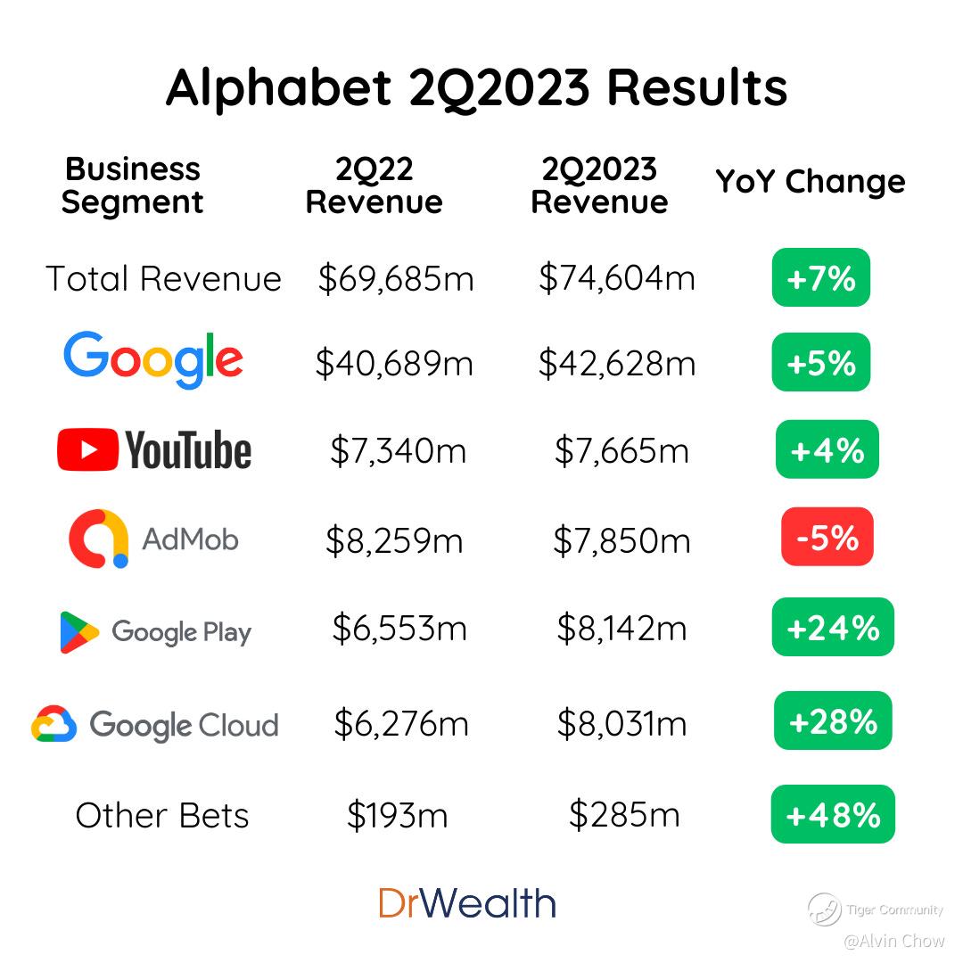 Revenue growth reaccelerating. Alphabet's overall revenue grew by 7% year on year, and the growth is reaccelerating. This performance exceeded expectations, especially considering concerns about lackluster ad revenue and potential competition from Microsoft's AI initiatives. The growth rate improved from 1% and 3% in the previous two quarters.