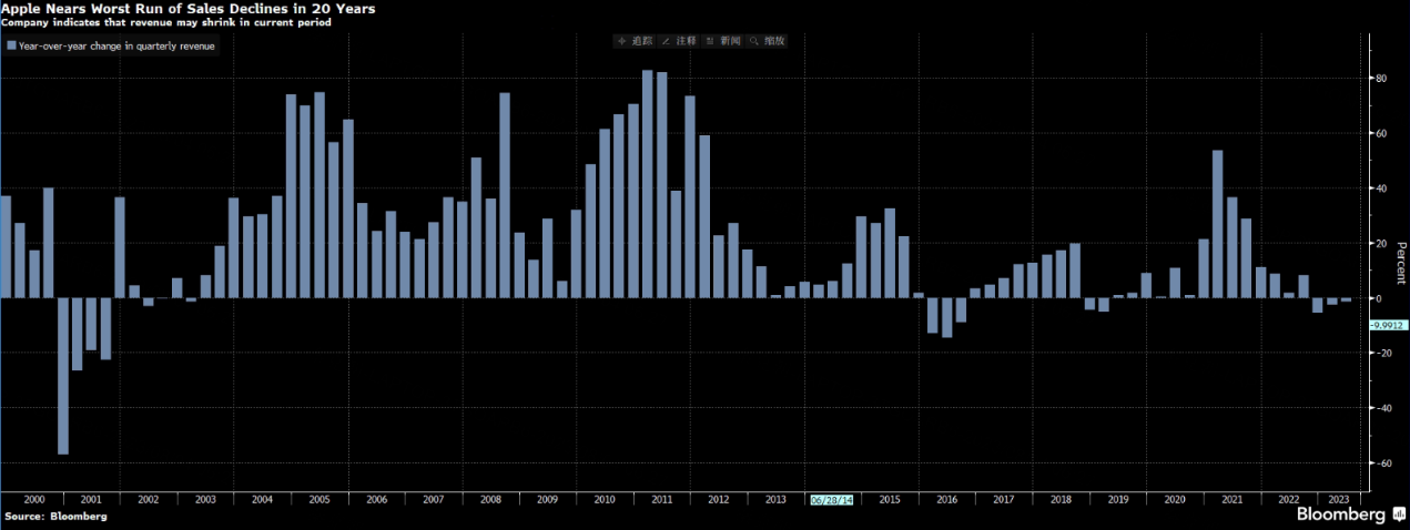 If Apple turns negative again in the next quarter, it will be the longest consecutive negative growth since 2000:
