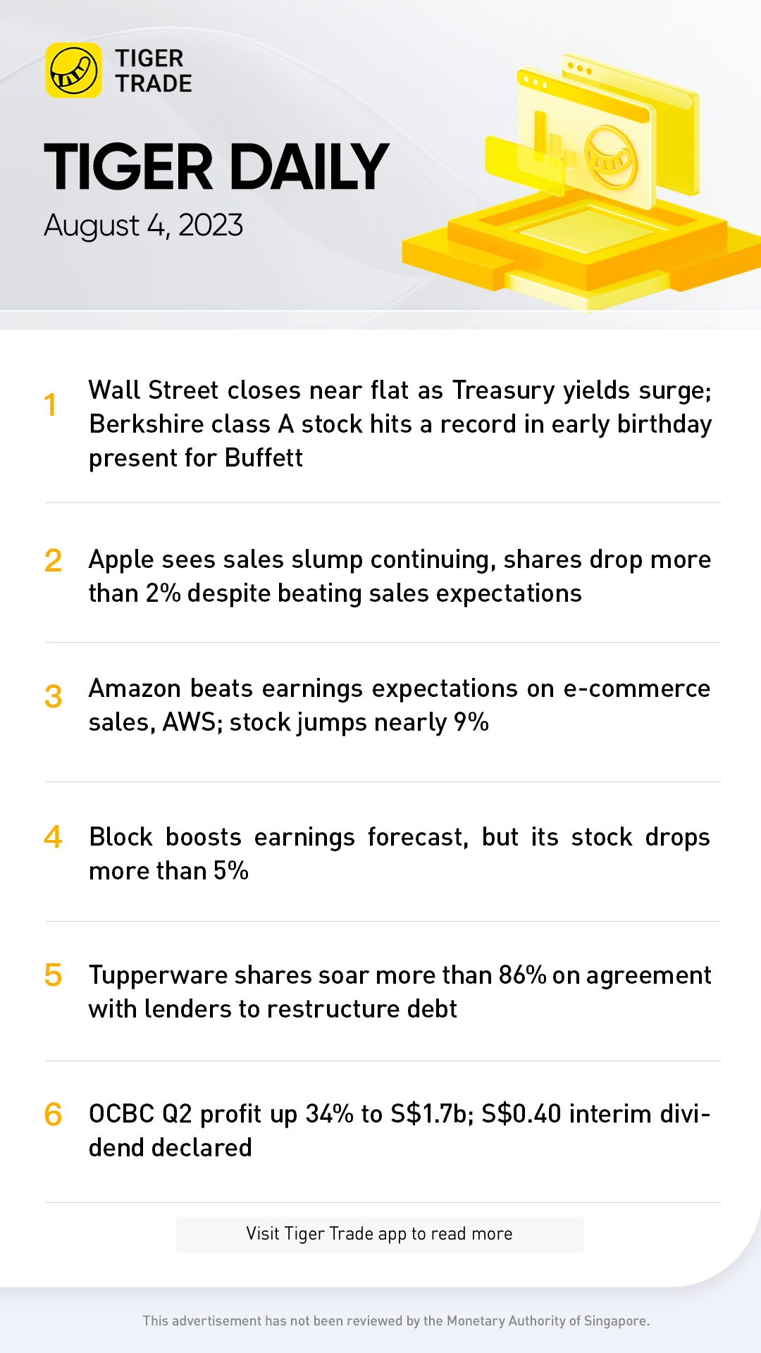 $Amazon.com(AMZN)$ โ€” The e-commerce giant popped more than 7% in extended trading after posting strong second-quarter results and issuing upbeat revenue guidance for the current period. Amazon reported earnings of 65 cents a share, ahead of the 35 cents expected by analysts, per Refinitiv. Revenue rose 11% during the period and came in at $134.4 billion, ahead of the expected $131.5 billion.