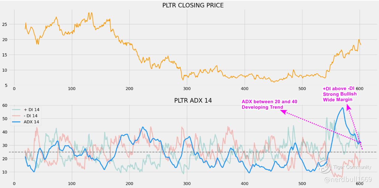 ADX is between 20 and 40 which indicate a developing trend, this would mean Palantir still have room for upside.