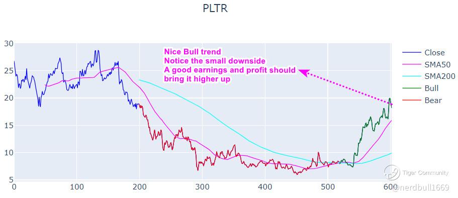 Based on SMA, Palantir have been in a bull trend since May 23 (around 90 trading days ago), it is currently trending above the SMA50.