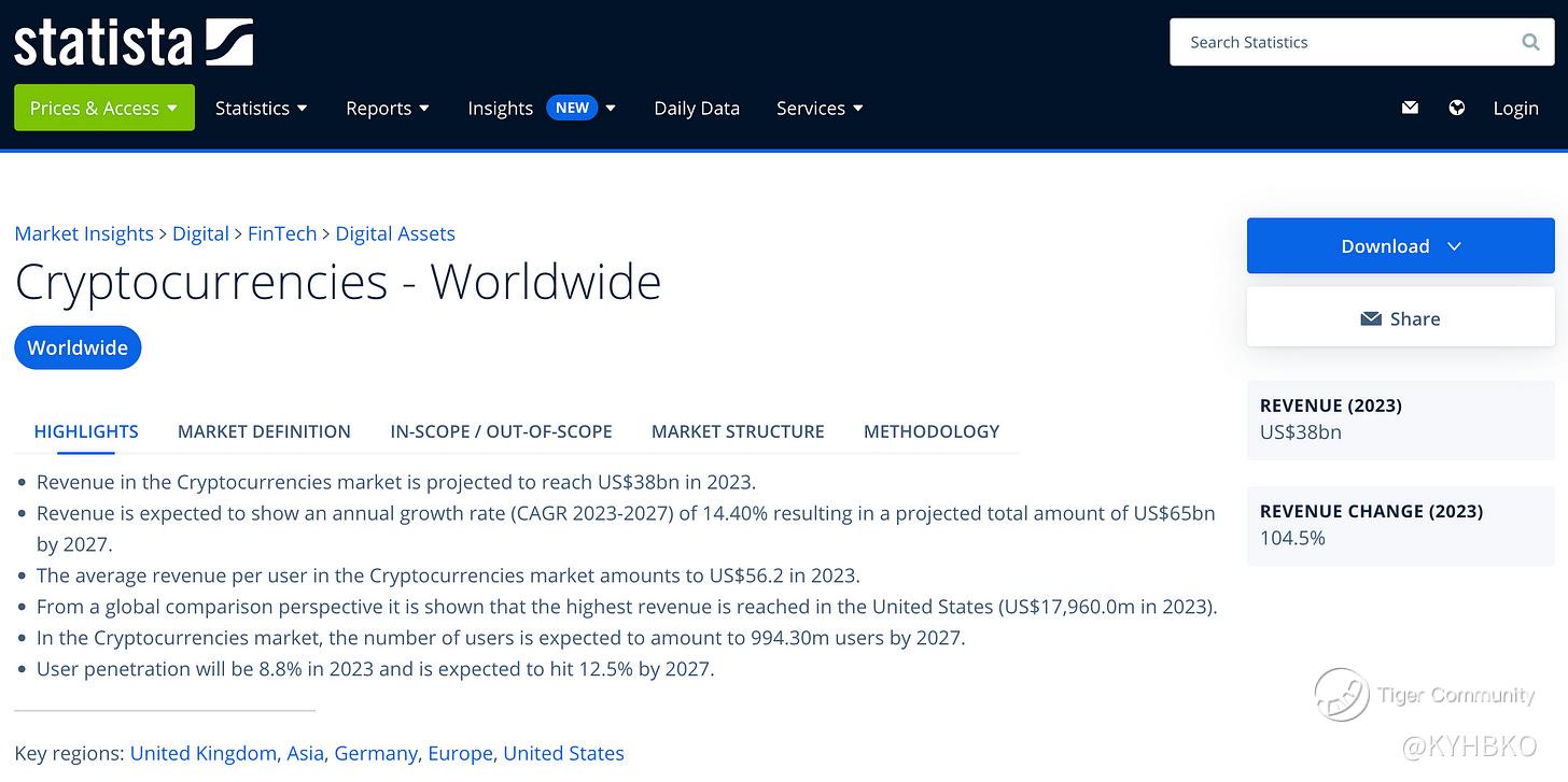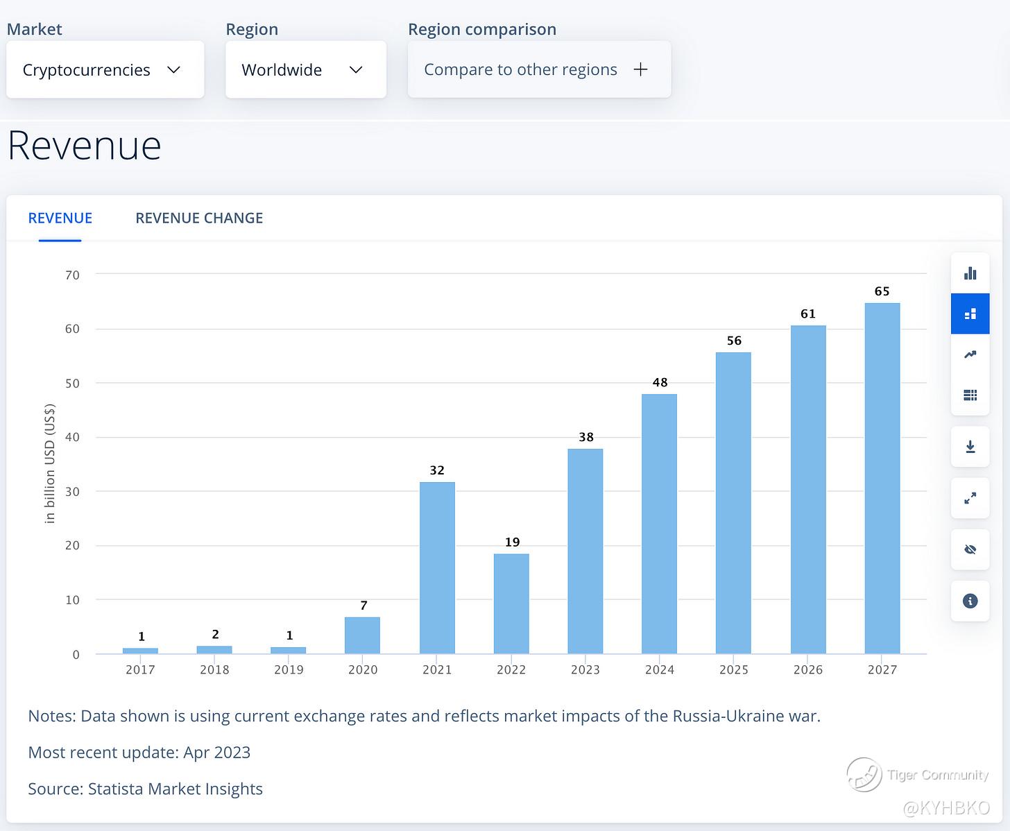 As per Statista’s data, the global cryptocurrency market is due to grow from $38B (2023) to $65B (2027).
