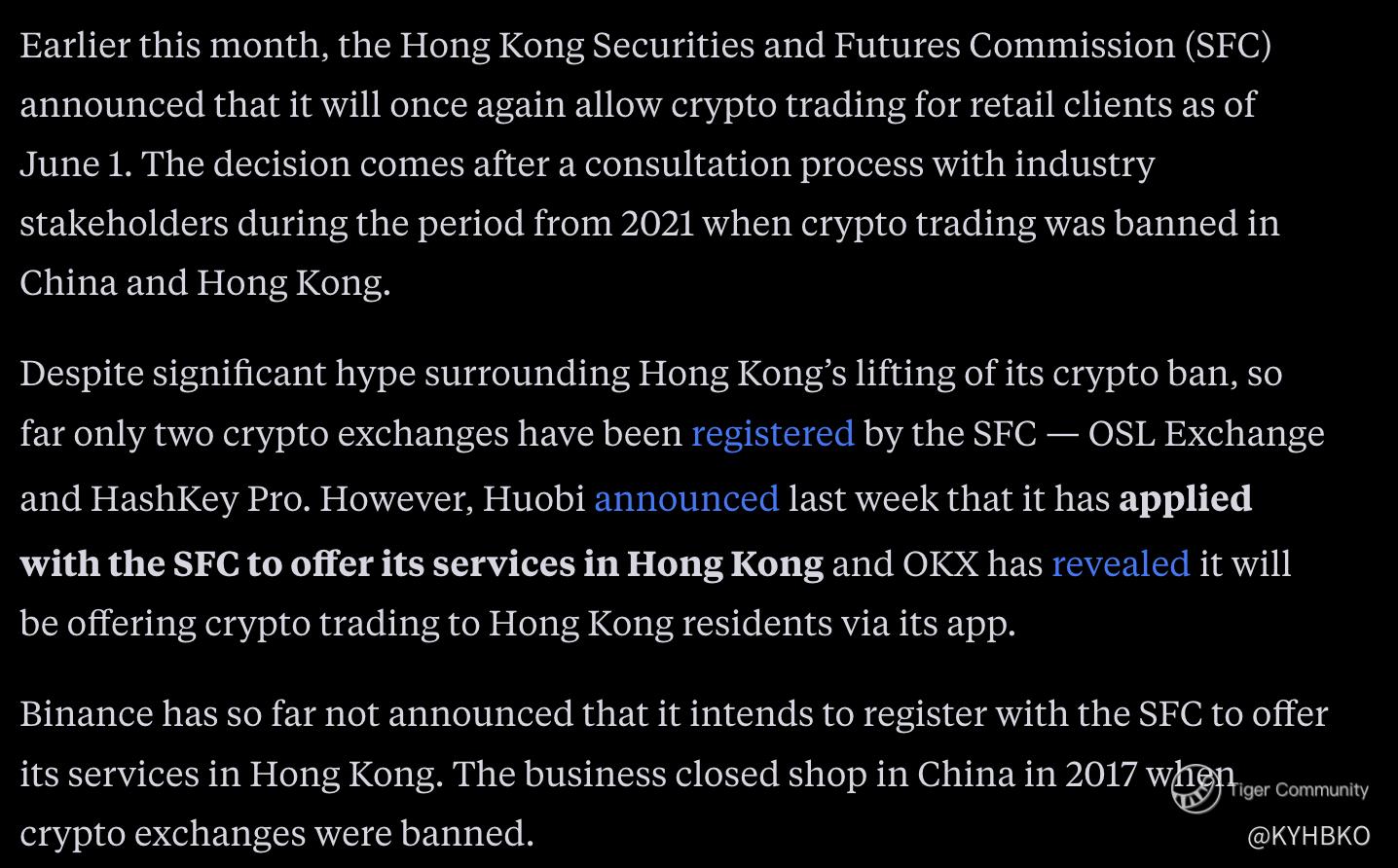 Hong Kong on Thursday reinstated retail crypto trading at select exchanges in what could serve as a test case for China reversing its 2021 ban on cryptocurrencies as per reported by Fortune in its 01 Jun 2023 article.