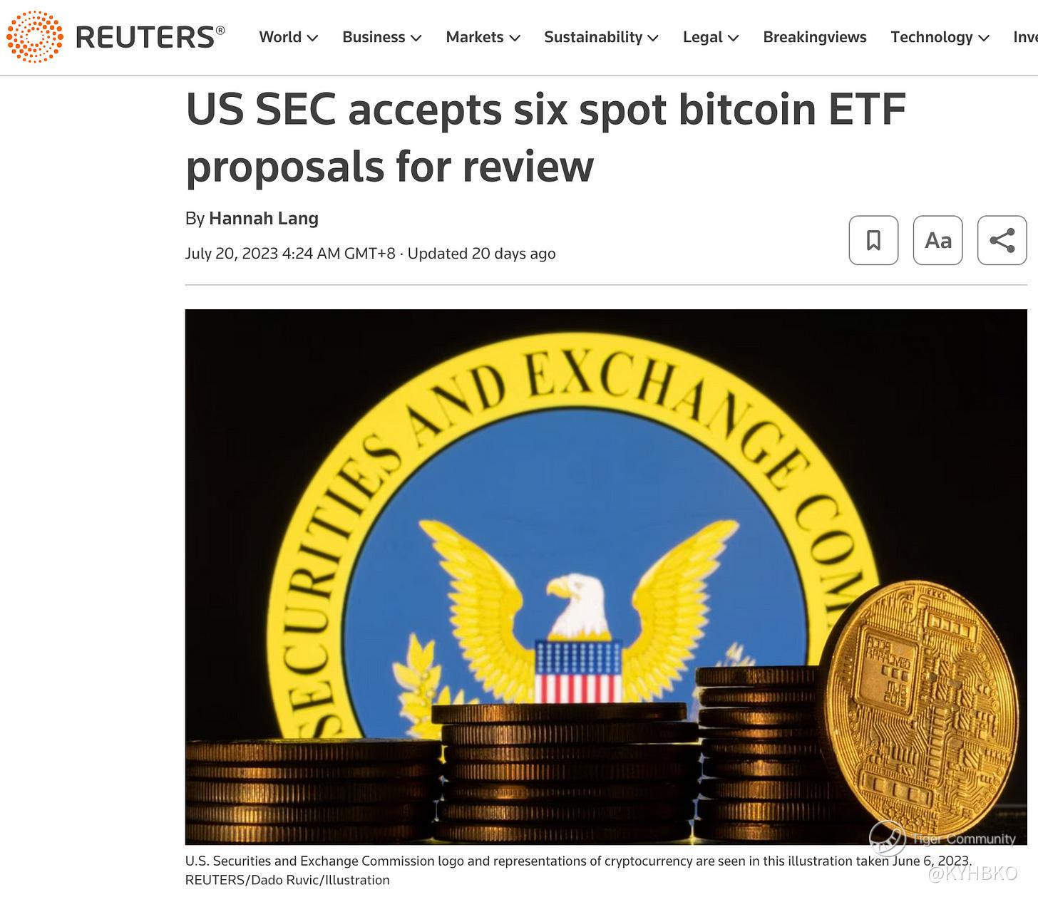 July 19 (Reuters) - The U.S. Securities and Exchange Commission (SEC) has accepted applications to create spot bitcoin exchange-traded funds from six firms including BlackRock for review, the first step in the agency's process for deciding whether or not to approve the latest round of proposals.The SEC also formally acknowledged applications from Bitwise, VanEck, WisdomTree, Fidelity and Invesco for similar spot bitcoin ETFs, with those proposals appearing on the Federal Register Tuesday and Wednesday.