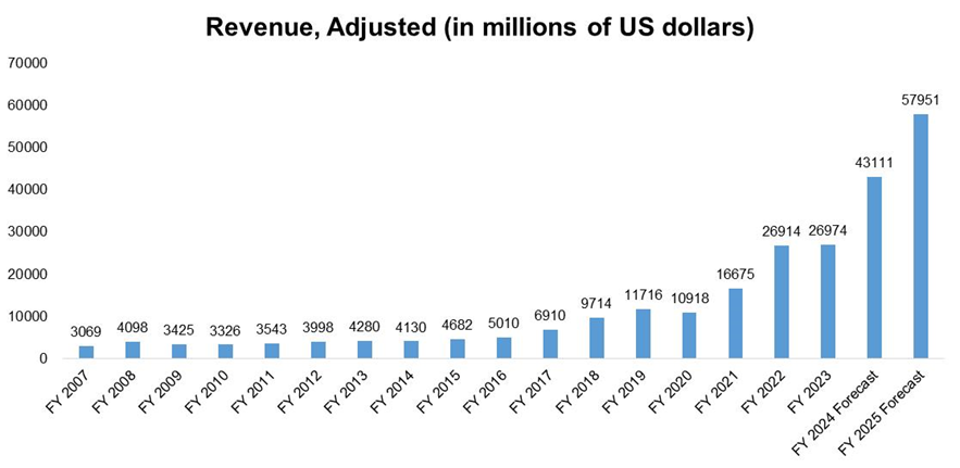 According to management's projections, NVIDIA's revenue for the second quarter is expected to be around $11 billion. Based on this, analysts predict that the company's revenue for the fiscal year 2024 could reach $43.1 billion and $58 billion in 2025: