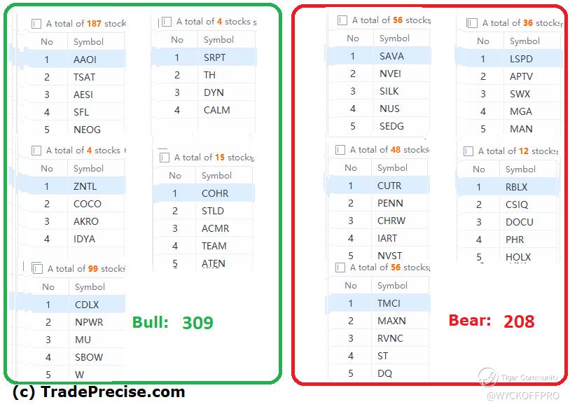 The bullish vs. bearish setup is 309 to 208 from the screenshot of my stock screener below pointing to a positive market environment. Yet, the increase in market volatility makes it challenging for upside follow-through for the majority of the stocks.