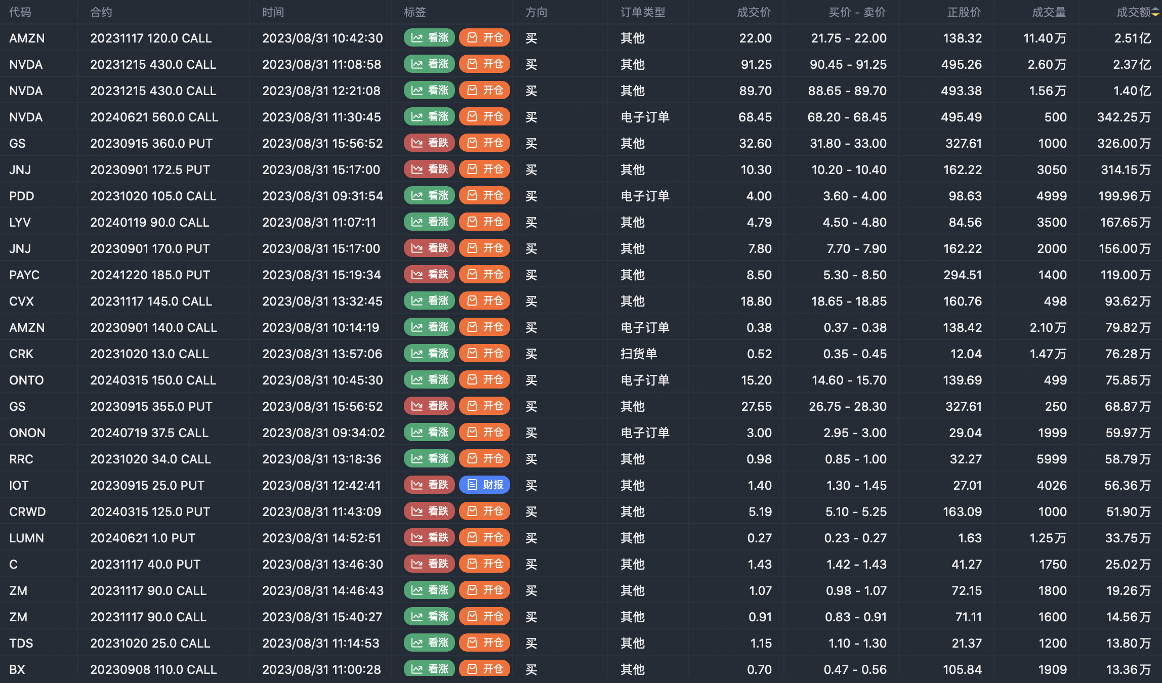 Note: This image data is from Tiger PC. This screening is a significant buy open position for options contracts in the market. The purchase of a call option means that the trader believes that the underlying has upward momentum, and the purchase of a put option means that the trader believes that the underlying has downward momentum. These contract openings typically indicate significant activity in the underlying stock, including whether the trader is willing to accumulate a long or short option position.