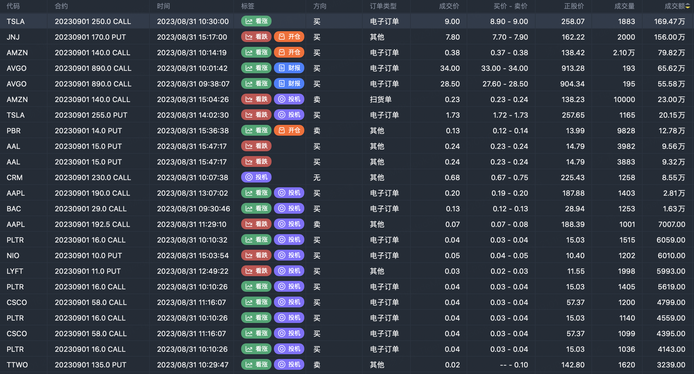 0DTE options for tech stocks are generally bullish: $AMZN 20230901 140.0 CALL$ $TSLA 20230901 250.0 CALL$ $AVGO 20230901 890.0 CALL$