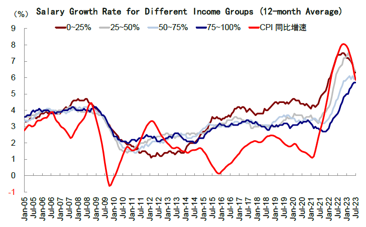 The rapid rise in wages for low-income groups has to some extent offset the erosion caused by high inflation, with the highest year-on-year growth rate reaching 7.5% in November 2022. However, a turning point in wage growth for low-income groups occurred later, and the low level of stock savings and insufficient inflow of funds may cause low-income groups to deplete their excess savings at the end of 2022.