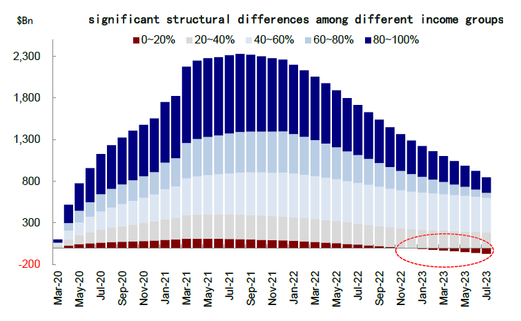 However, with the recovery of post-pandemic consumption scenarios, service prices have risen, and high-income groups with a higher proportion of service consumption expenditures have accelerated their consumption of excess savings (before the pandemic, high-income groups' service consumption expenditures accounted for 35% of total expenditures, with transportation and entertainment services accounting for over 40%). As of July 2023, excess savings for the top 20% of earners have fallen to 24%.