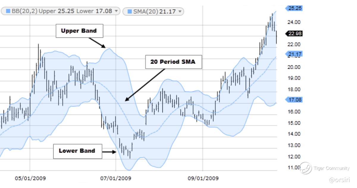 Upper Band: Calculate the standard deviation of the price over the same period as the SMA and then multiply it by two. Add this to the middle band.