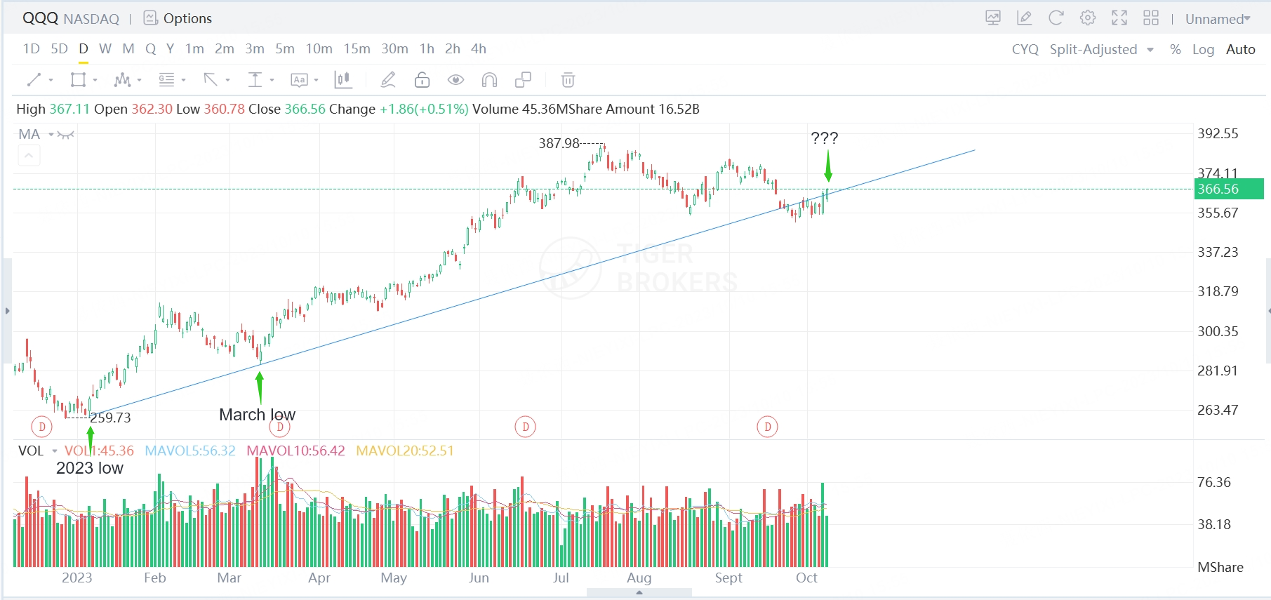 From a technical analysis standpoint, it's worth noting that on Friday, QQQ's closing price landed just below the 2023 trendline and the 50-day Simple Moving Average (SMA).