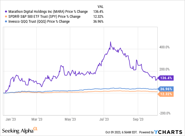 MARA shares are currently up 136% YTD and have outperformed the S&P 500 and NASDAQ 100 by a wide margin.
