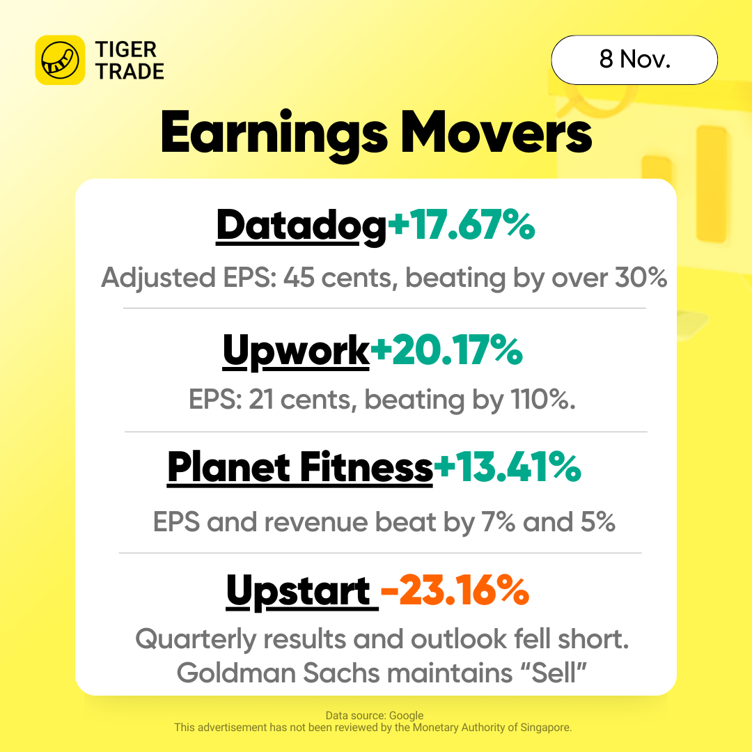 Earnings Movers | DDOG, UPWK beat EPS over 30%; GS maintains "Sell" for UPST after earnings miss
