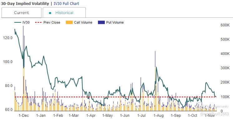 This means that 40% of the time the IV was lower in the last year than the current level. The current IV (73.5) is -3.3% below its 20 day moving average (76.0) indicating implied volatility is trending lower.