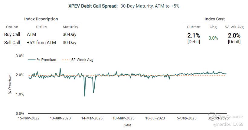 XPEV Call Spread Benchmark Index (30-Day Maturity, ATM to +5%) is unchanged today at 2.1% premium to stock price. This value is above its 52-week average premium of 2.0%.