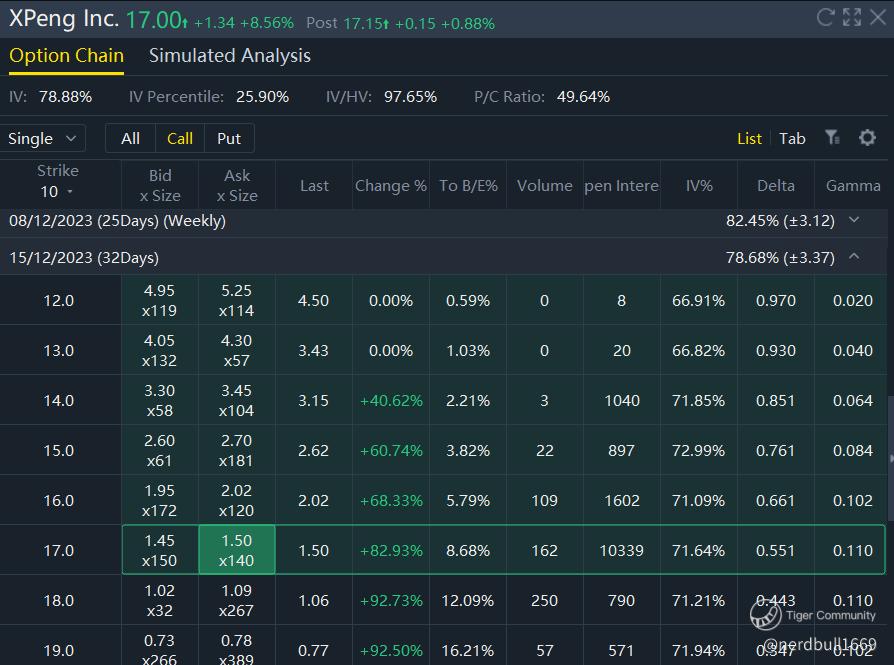 XPeng last close price as of 14 Nov 2023 is $17.00, I will be using this contract that expiration date is 32 days away on 15 Dec 2023, I will make one leg to buy a call on the $17 strike for $1.50.
