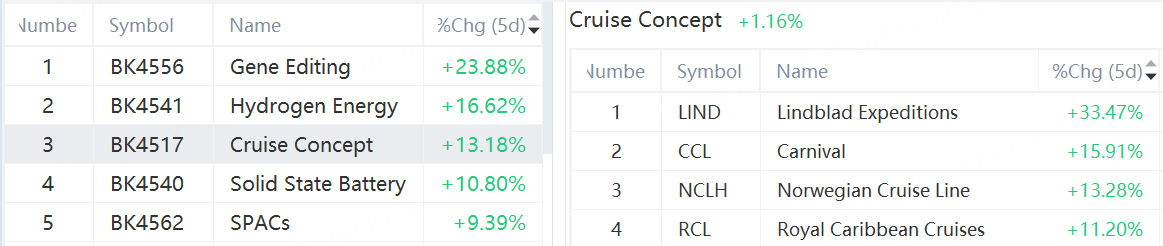 Stocks continued to rally this week, with the S&P 500 closing green in 13 of the last 15 sessions. The best-performing concepts are gene editing, hydrogen energy and cruise concept.