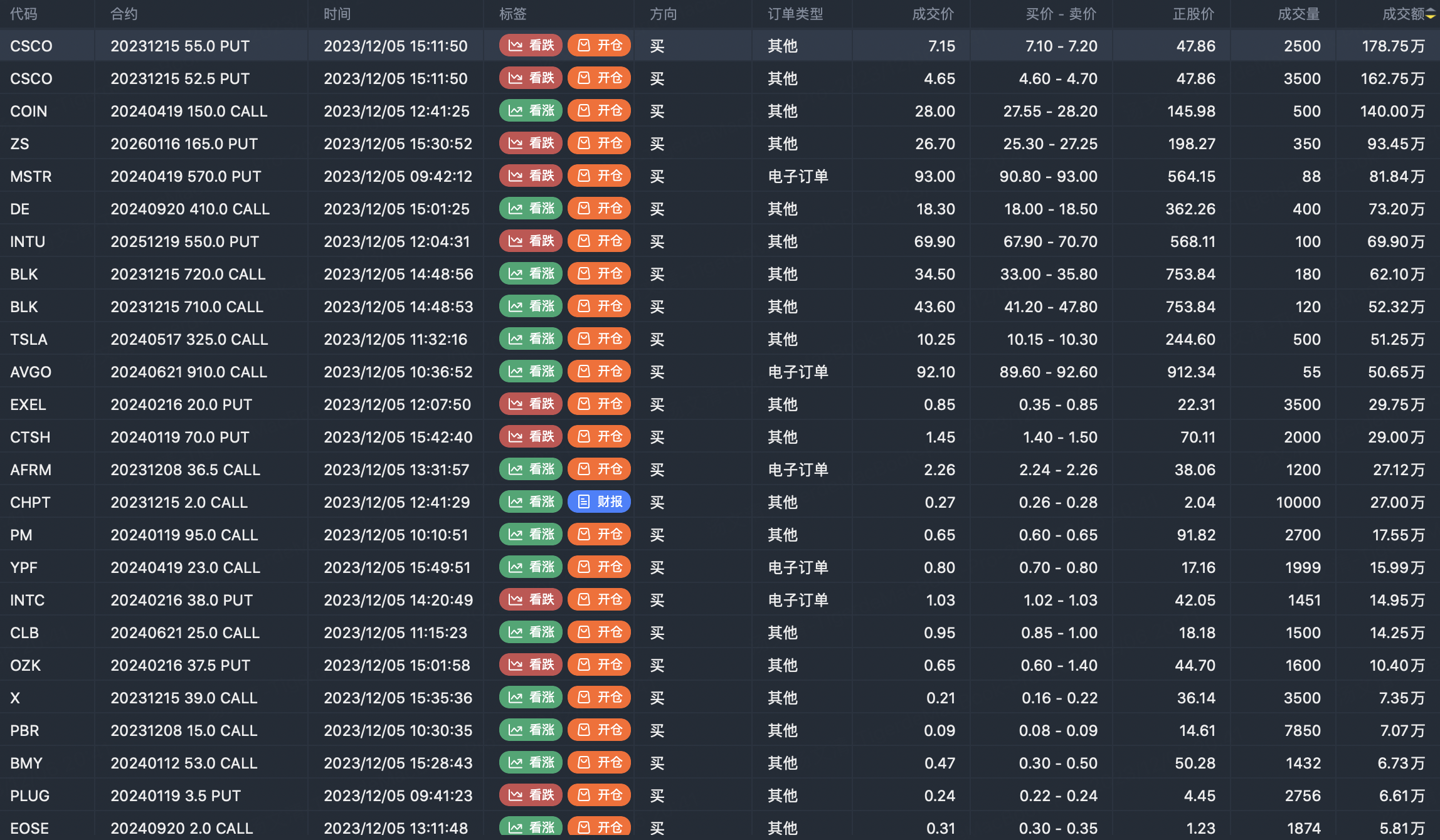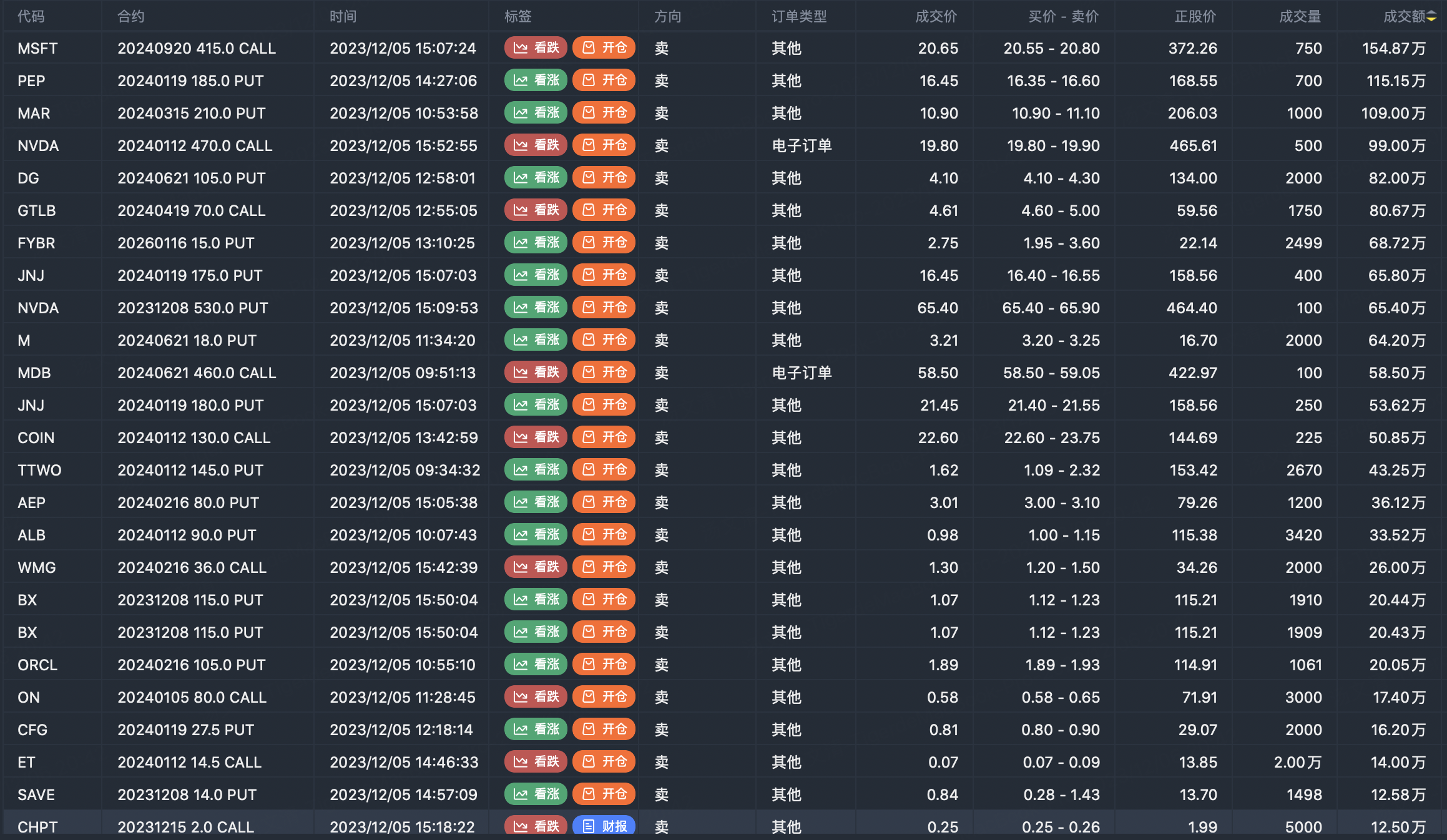 Note: This image data is from Tiger PC. This screen is a significant sell open position for an option contract in the market. A sell of a call option means that the trader believes that the underlying trend has peaked, and a sell of a put option means that the trader believes that the underlying trend has bottomed. These contract openings typically indicate significant activity in the underlying stock, including whether the trader is willing to accumulate a long or short option position.