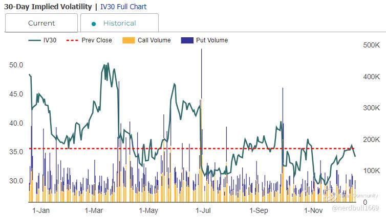 Micron's last earnings implied volatility (IV30) going into earnings was 38.8. The last time Micron released earnings, the implied volatility dropped to 33.1, resulting in an implied vol crush of 15%. 5 days after earnings, the 30 day IV was 34.3.