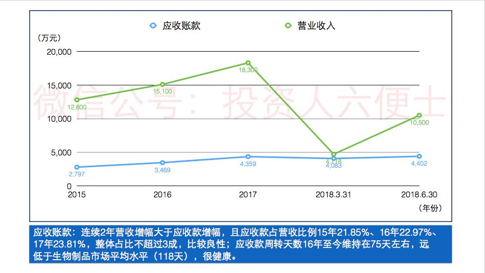 連續2年營收增幅大於應收款增幅,且應收款佔營收比例15年21.85%、16年22.97%、17年23.81%,整體佔比不超過3成,比較良性;應收款週轉天數16年至今維持在75天左右,遠低於生物製品市場平均水平(118天),很健康。