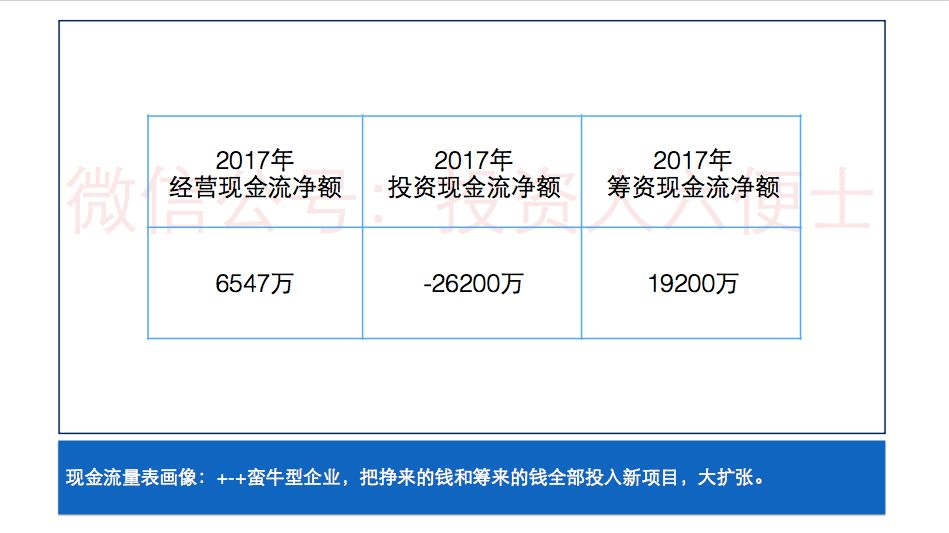 現金流量畫像爲“+-+”型,典型的蠻牛型企業,把掙來的錢和籌來的錢全部投入新項目,高速成長。