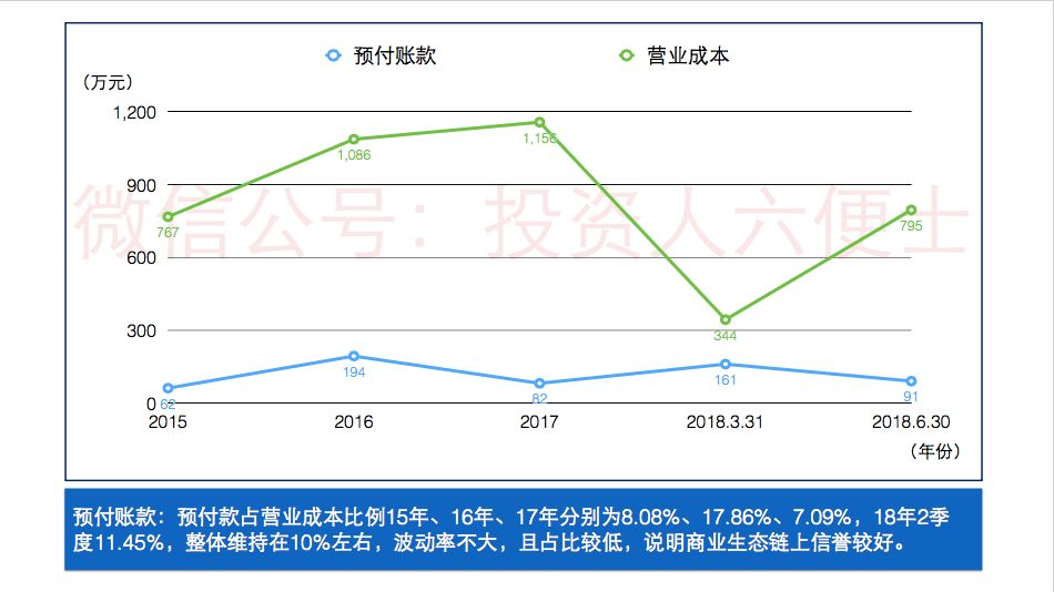 預付款佔營業成本比例15年、16年、17年分別爲8.08%、17.86%、7.09%,18年2季度11.45%,整體維持在10%左右,波動率不大,且佔比較低,說明商業生態鏈上信譽較好。