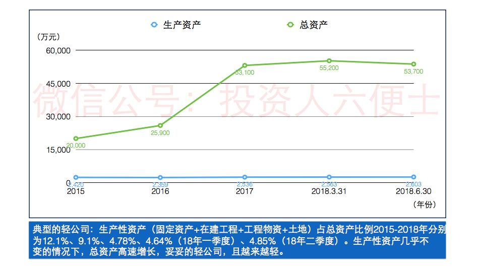 生產性資產(固定資產+在建工程+工程物資+土地)佔總資產比例2015-2018年分別爲12.1%、9.1%、4.78%、4.64%(18年一季度)、4.85%(18年二季度)。生產性資產幾乎不變的情況下,總資產高速增長,妥妥的輕公司,且越來越輕。
