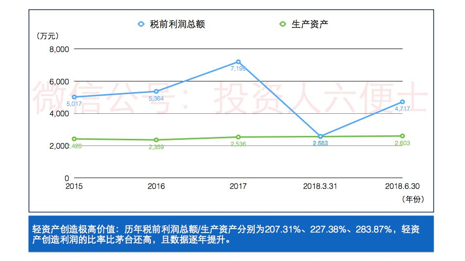 歷年稅前利潤總額/生產資產分別爲207.31%、227.38%、283.87%,輕資產創造利潤的比率比茅臺還高,且數據逐年提升,大部分利潤是由“輕”資產創造的。