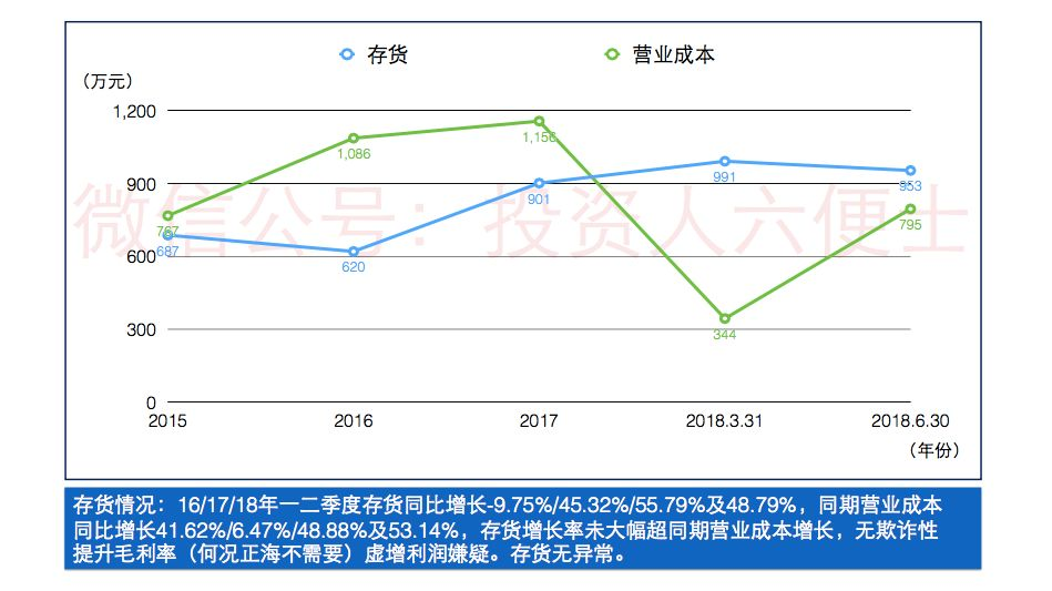 16/17/18年一二季度存貨同比增長-9.75%/45.32%/55.79%及48.79%,同期營業成本同比增長41.62%/6.47%/48.88%及53.14%,存貨增長率未大幅超同期營業成本增長,無欺詐性提升毛利率(何況正海不需要)虛增利潤嫌疑。存貨無異常。