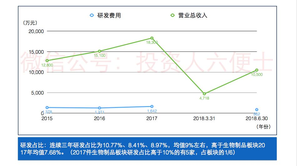 連續三年研發佔比爲10.77%、8.41%、8.97%,均值9%左右,高於生物製品板塊2017年均值7.68%。(2017件生物製品板塊研發佔比高於10%的有5家,佔板塊的1/6)