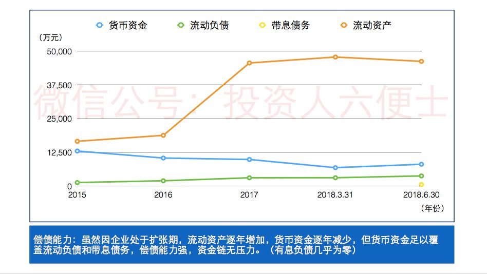 雖然因企業處於擴張期,流動資產逐年增加,貨幣資金逐年減少,但貨幣資金足以覆蓋流動負債和帶息債務,償債能力強,資金鍊無壓力。