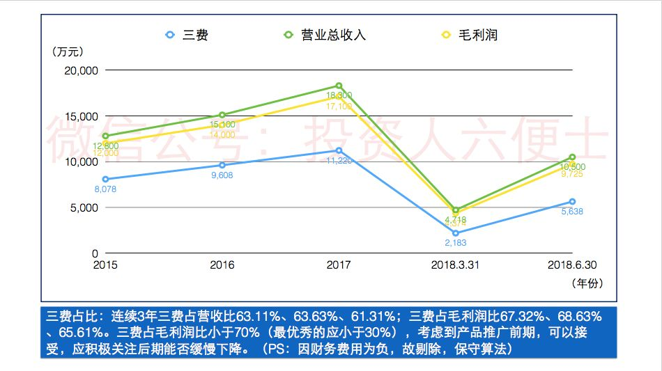 連續3年三費佔營收比63.11%、63.63%、61.31%;三費佔毛利潤比67.32%、68.63%、65.61%。三費佔毛利潤比小於70%(最優秀的應小於30%),考慮到產品推廣前期,可以接受,應積極關注後期能否緩慢下降。(PS:因財務費用爲負,故剔除,保守算法)
