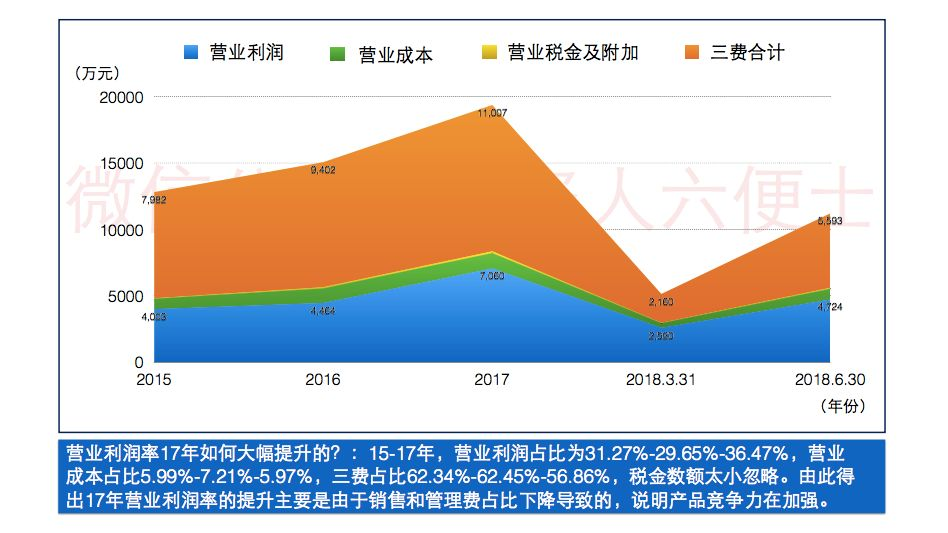 15-17年,營業利潤佔比爲31.27%-29.65%-36.47%,營業成本佔比5.99%-7.21%-5.97%,三費佔比62.34%-62.45%-56.86%,稅金數額太小忽略。由此得出17年營業利潤率的提升主要是由於銷售和管理費佔比下降導致的,明產品競爭力在加強。