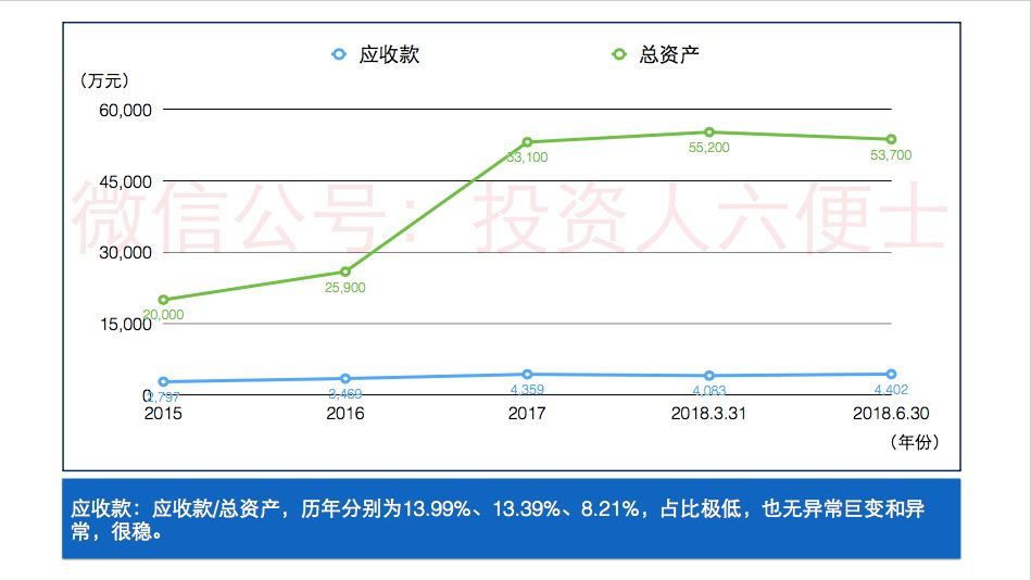 應收款/總資產,歷年分別爲13.99%、13.39%、8.21%,佔比極低,也無異常鉅變和異常,很穩。