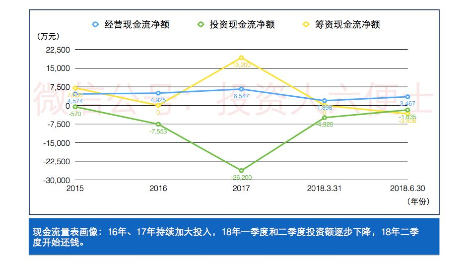16年、17年持續加大投入,18年一季度和二季度投資額逐步下降,18年二季度開始還錢。