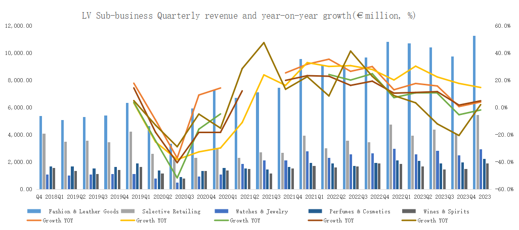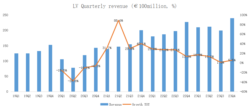 Specifically, LV's revenue in the fourth quarter was €23.948 billion, a 5.5% year-on-year increase: