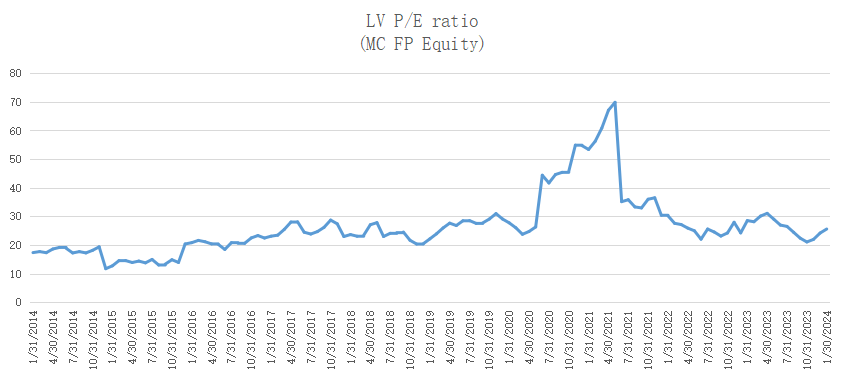 After the big increase, LV's PE ratio is 25 times, which is at a historical median. There is still some room for further upside, but analysts expect revenue growth of only 5.69% in 2024 compared to pre-pandemic years, which may limit LV's upside potential: