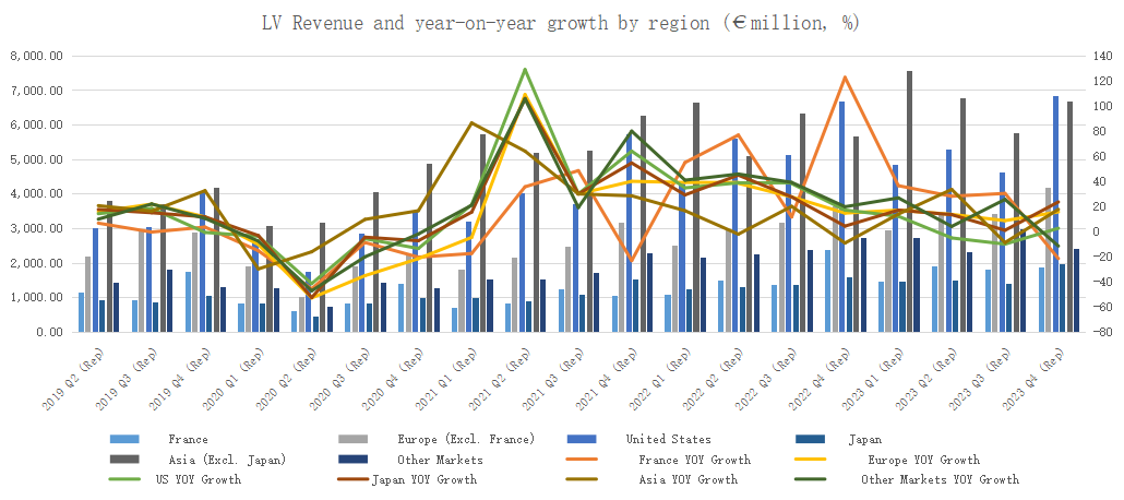 As LV's main source of revenue, the United States contributed 28.6% of total revenue. Its stabilization and recovery has dispelled market pessimism about luxury goods, while China's recovery has been weaker than expected. However, due to the low base in the fourth quarter of 2022, growth rates are still acceptable.