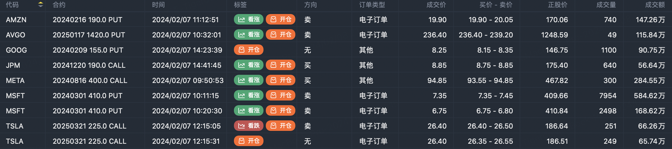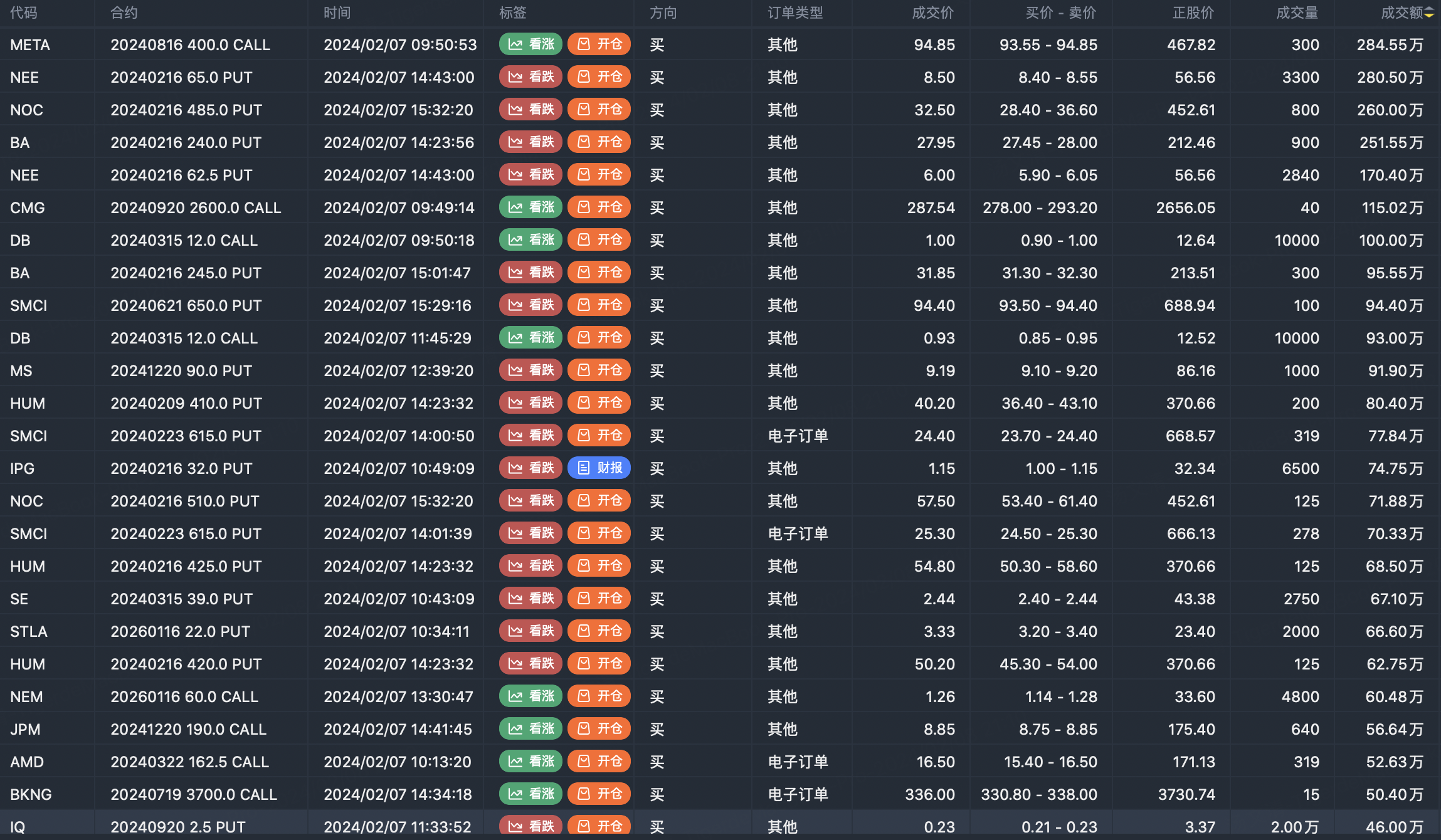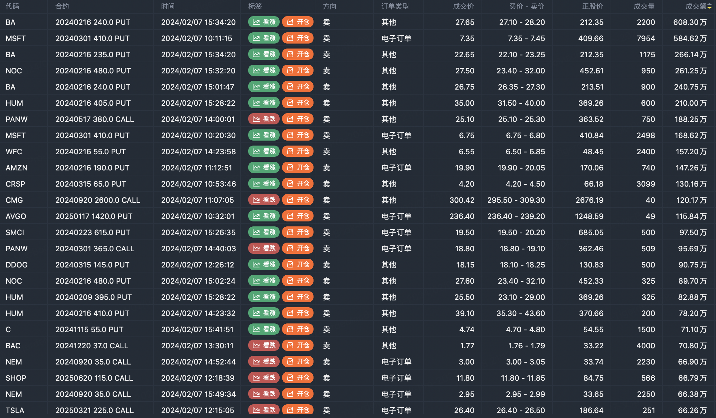 Note: This image data is from Tiger PC. This screen is a significant sell open position for an option contract in the market. A sell of a call option means that the trader believes that the underlying trend has peaked, and a sell of a put option means that the trader believes that the underlying trend has bottomed. These contract openings typically indicate significant activity in the underlying stock, including whether the trader is willing to accumulate a long or short option position.