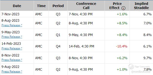 Estimated implied straddle for upcoming earnings is 6.3%. I am expecting to see at least 2% upside from how the implied straddle have played out over the year.