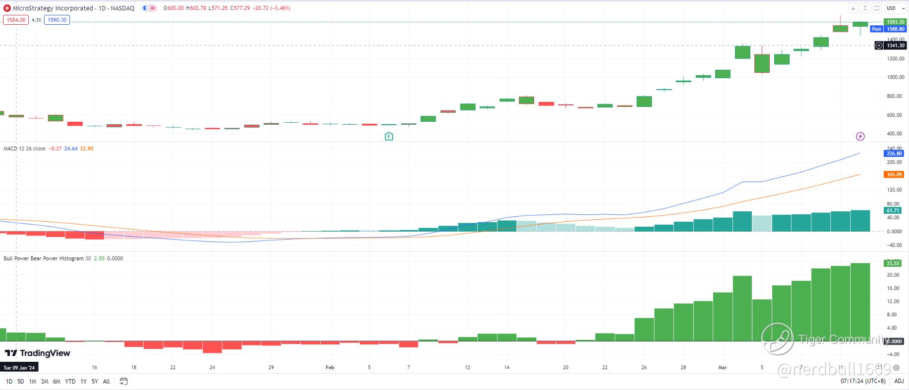 If we look at the daily intra chart, we can see that Bull power is gathering and the MACD is also moving in an upward trend. This would mean that we could be seeing MicroStrategy creating another new high if Bitcoin continue its rally towards the intrinsic value at $81,000.
