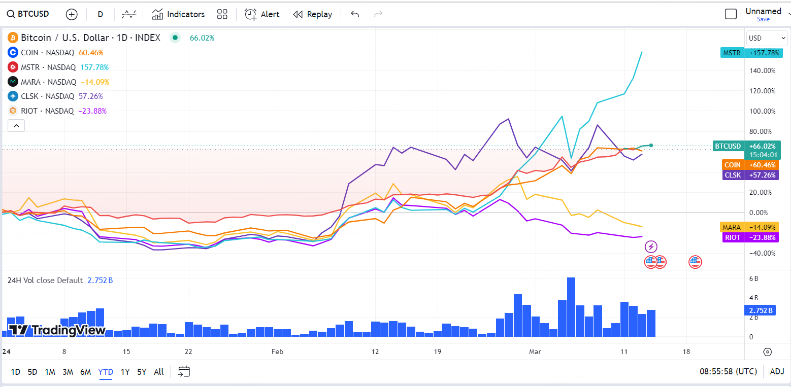 $Coinbase Global, Inc.(COIN)$ and $CleanSpark, Inc.(CLSK)$ have closely followed BTC's performance.