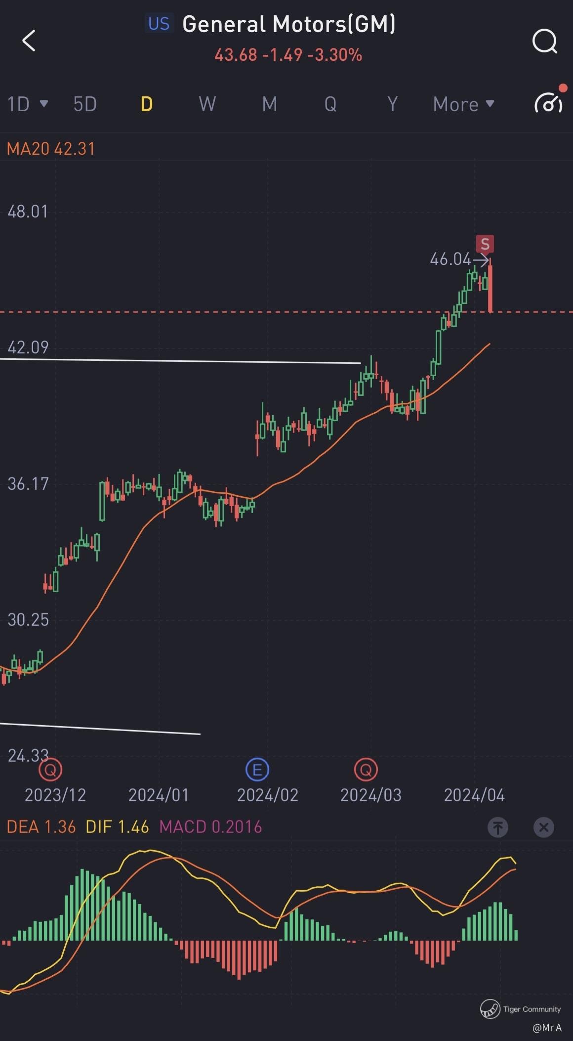 $General Motors(GM)$ another case of after closing position and next day fall. Seeing the MACD, trend support line did helps in making fast decision.