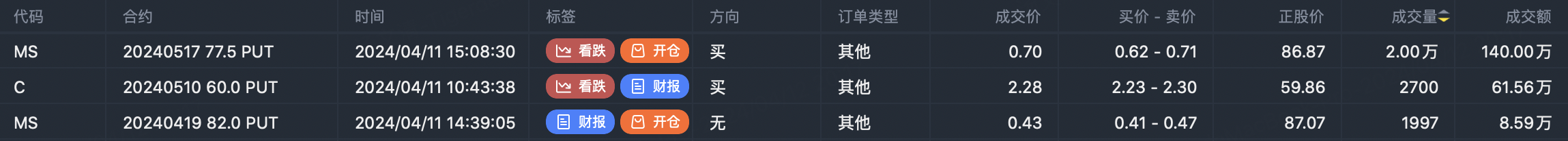 For $Morgan Stanley(MS)$ earnings due 04/16, the options market is bearish with 20k contracts traded in the $MS 20240517 77.5 PUT$ puts for $1.4m premium, positioning for a revenue miss based on analyst estimates of -0.7% YoY.