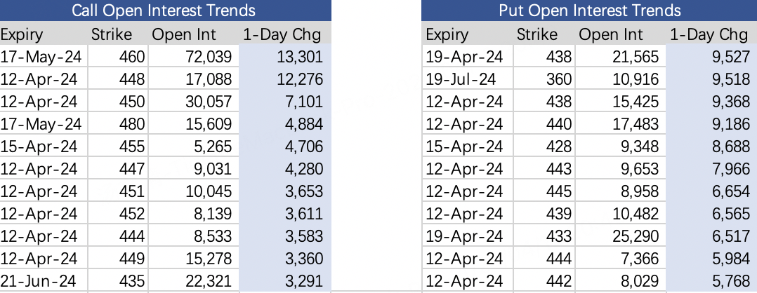 For $Invesco QQQ Trust-ETF(QQQ)$ , the largest new call buy is the 05/17 460 strike at 13k contracts $QQQ 20240517 460.0 CALL$ . But traded delta shows this position is a sell expecting <4.3% upside by mid-May.