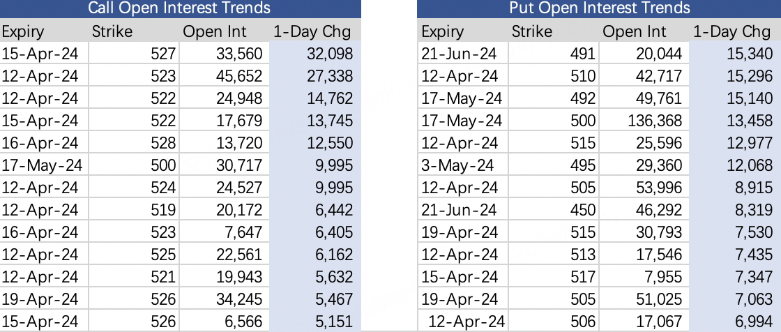 The most active new $SPY 20240415 527.0 CALL$ call is the 04/15 527 strike with 32k contracts added. For puts, it's the $SPY 20240621 491.0 PUT$ 06/21 491 strike, 15k new positions.