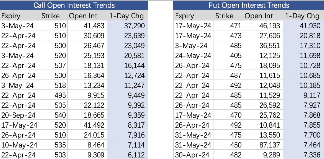 For call options, investors bought the most new $SPY 20240503 510.0 CALL$ , with a 510 strike expiring May 3, adding 37,000 contracts, suggesting expectations for SPY to trade above $510 by May 3, a 3% two-week rally.